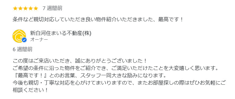 - 条件など親切対応していただき良い物件紹介いただきました、最高です!